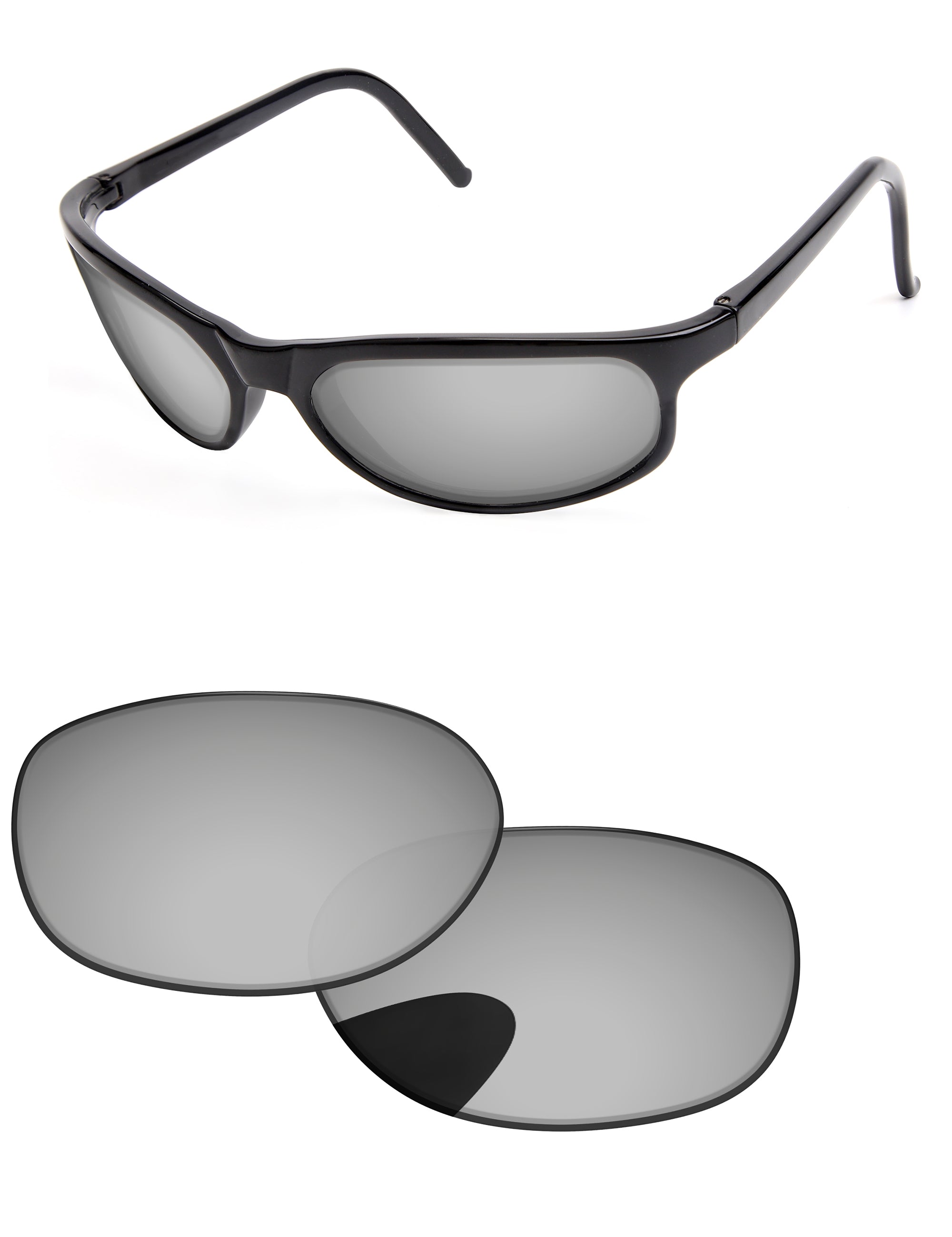 Silver photochromic lenses darken in direct UV light. Regular Transparent color indoors.
