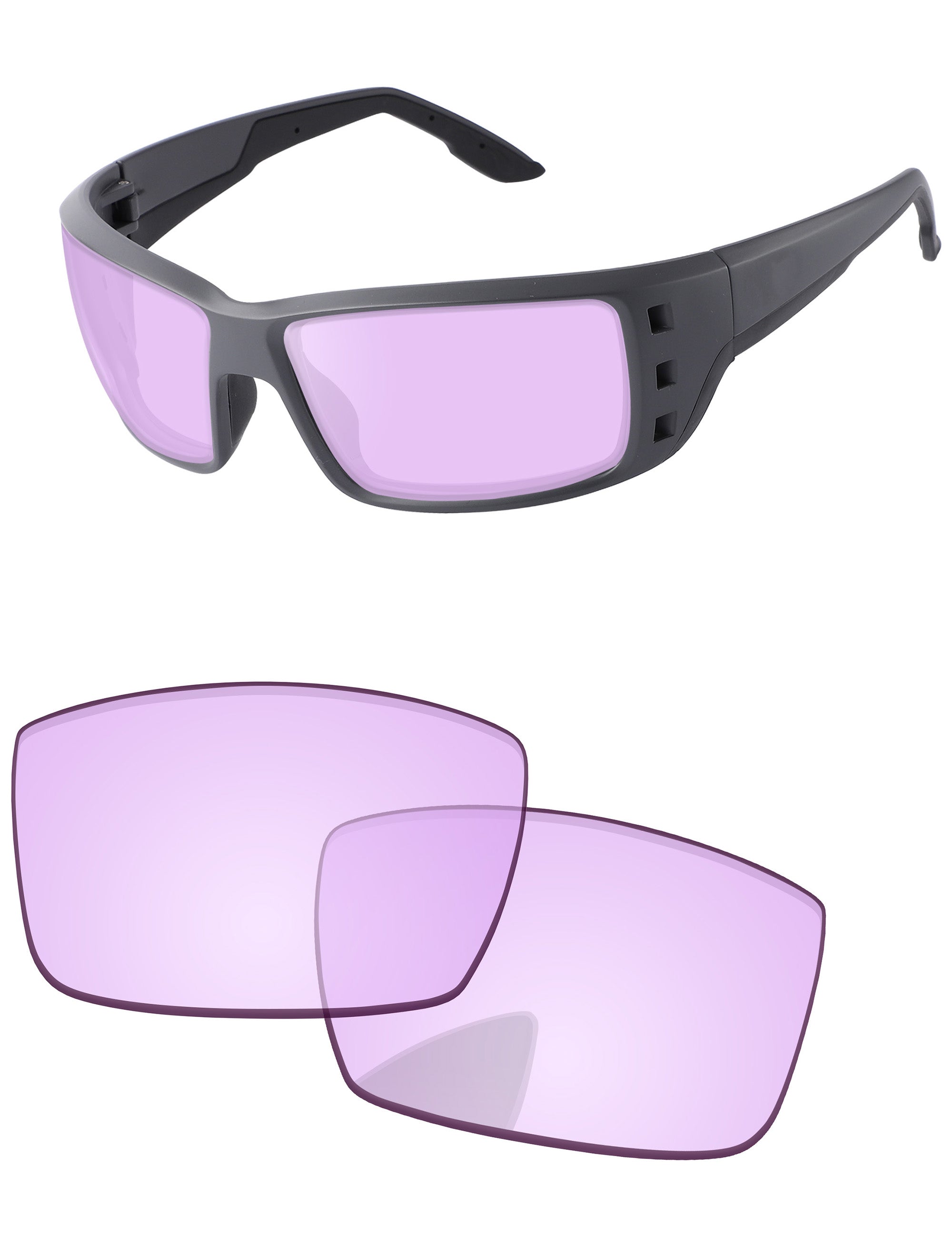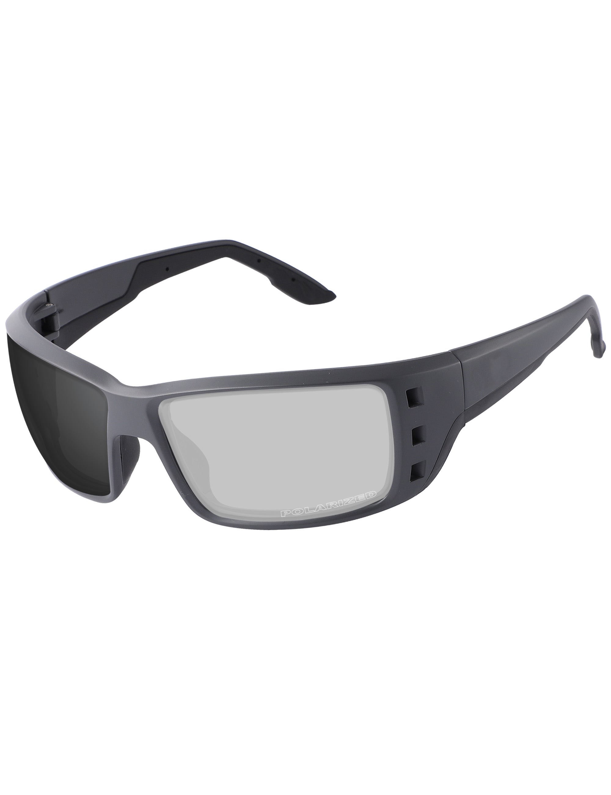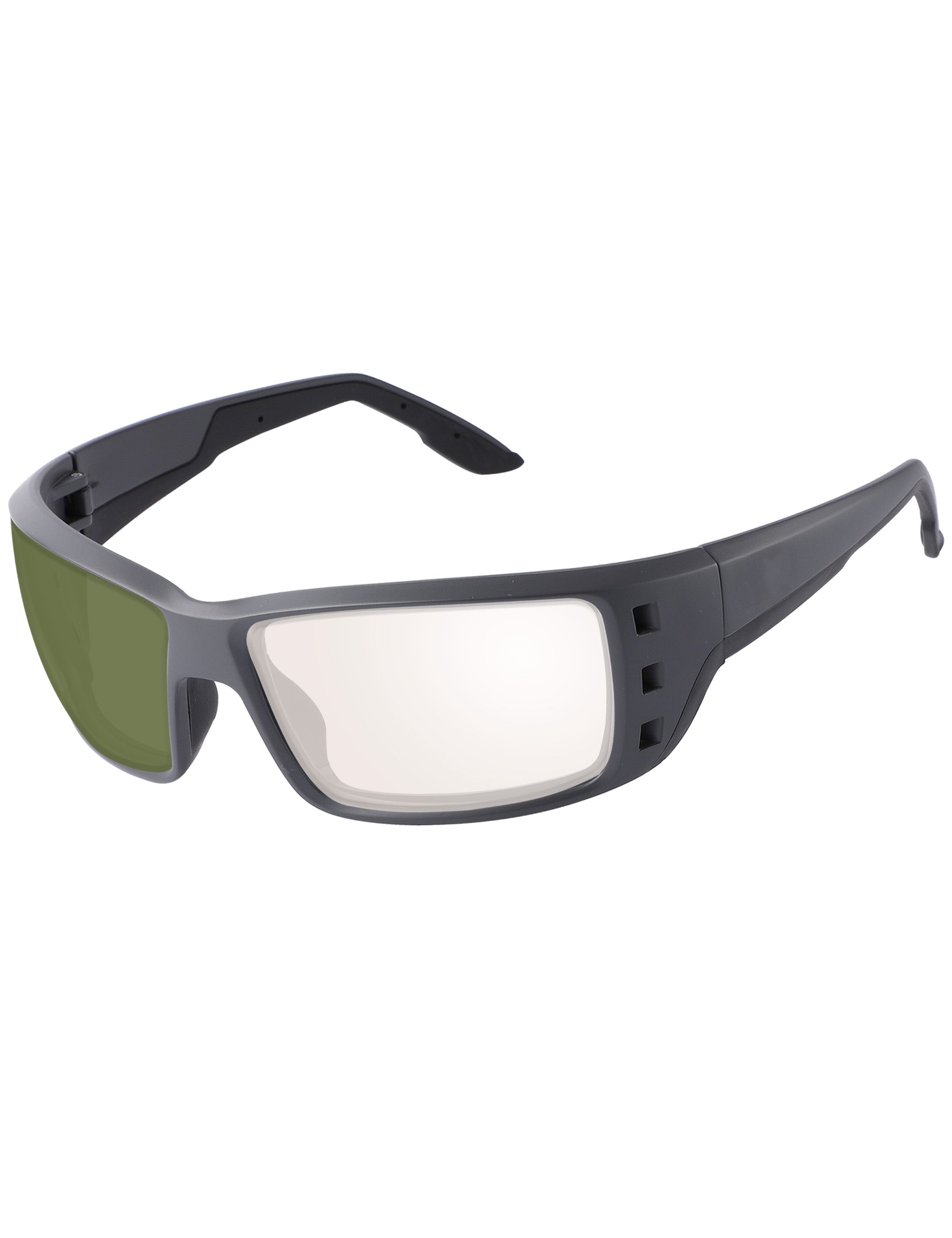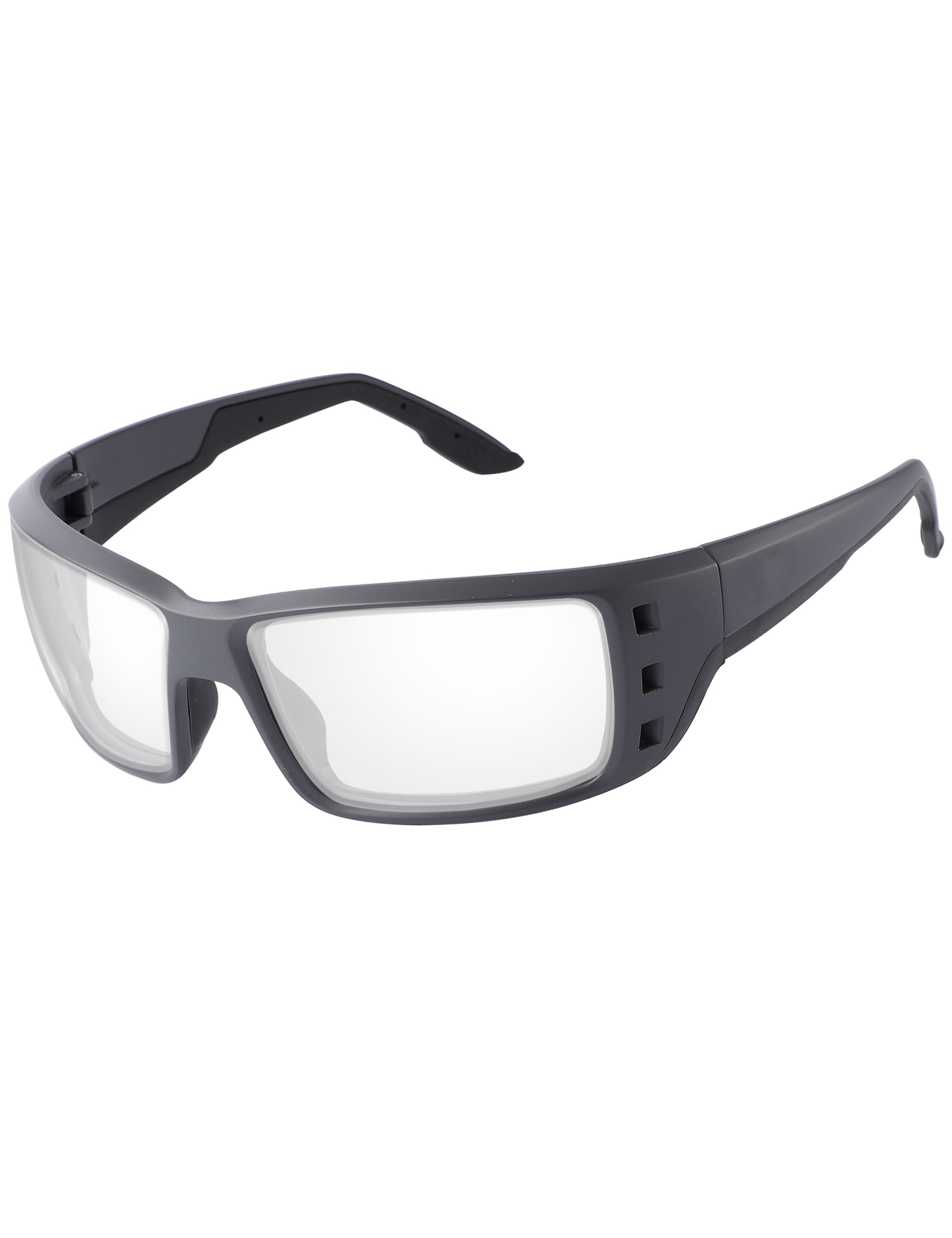 Gray photochromic lenses darken in direct UV light. Regular Transparent color indoors.