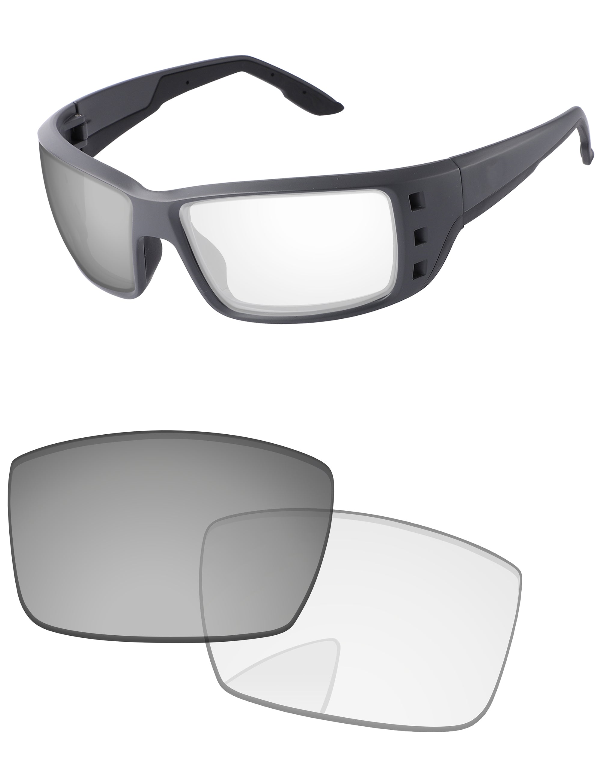 Silver photochromic lenses darken in direct UV light. Regular Transparent color indoors.