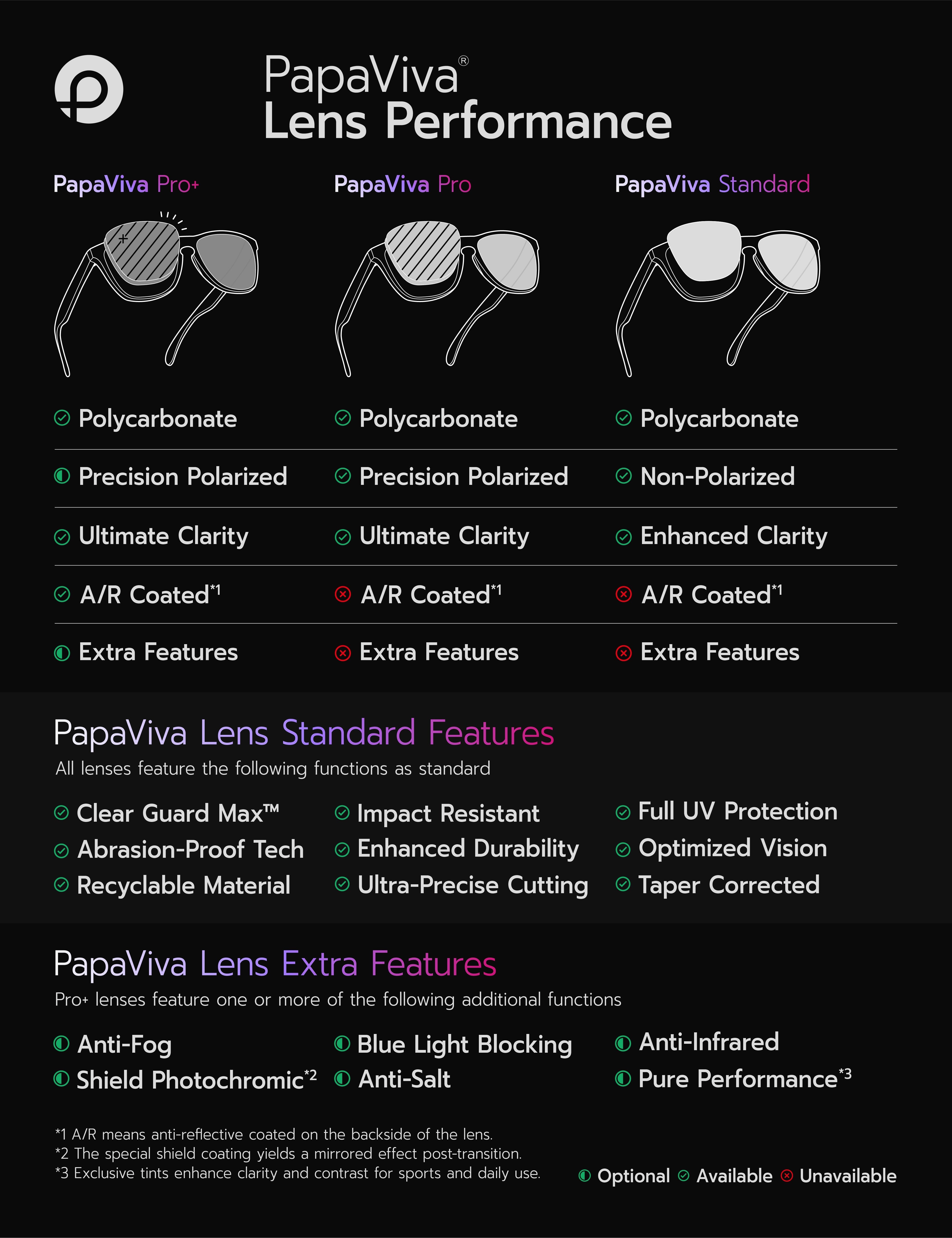 Selected PapaViva® lens models feature advanced polarization technology that reduces reflected glare from surfaces like water and roads. Please check the product specifications to confirm polarization availability for your chosen product.
